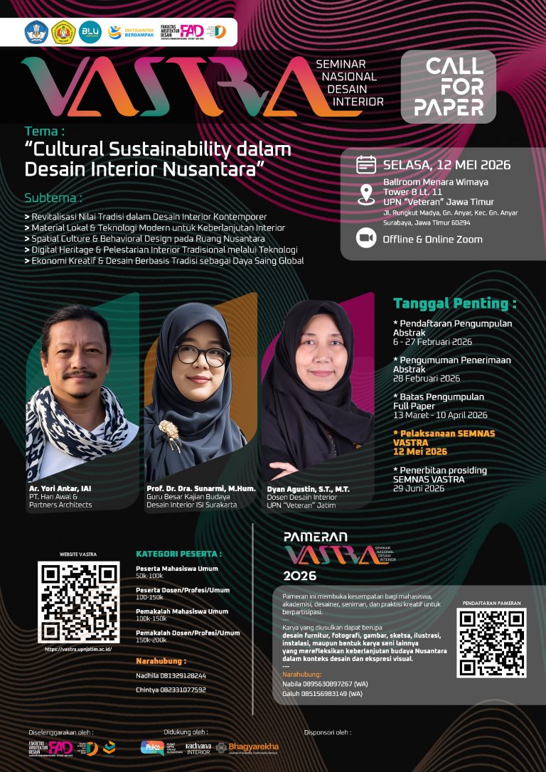 📱Chintya (0823 3107 7592)#VASTRA2026 #SeminarNasional #SemnasDesainInterior #DesainInterior #InteriorNusantara #CulturalSustainability #UPNVeteranJatim #DesainInteriorUPN #PameranDesain #SDGs4UPNVJT #SDGs8UPNVJT #SDGs9UPNVJT